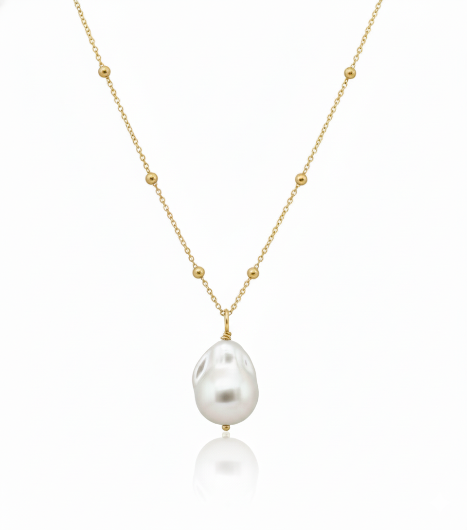 Delicate yet bold, the 9ct Ball Chain with Keshi Pearl Pendant is your not-so-basic essential. A 11–12mm white Keshi freshwater pearl floats on a fine 45cm 9ct yellow gold ball chain. Organic texture meets sleek minimalism. Each pearl is one of a kind, just like the babe who wears it.